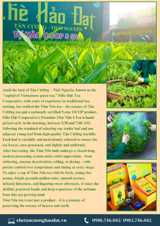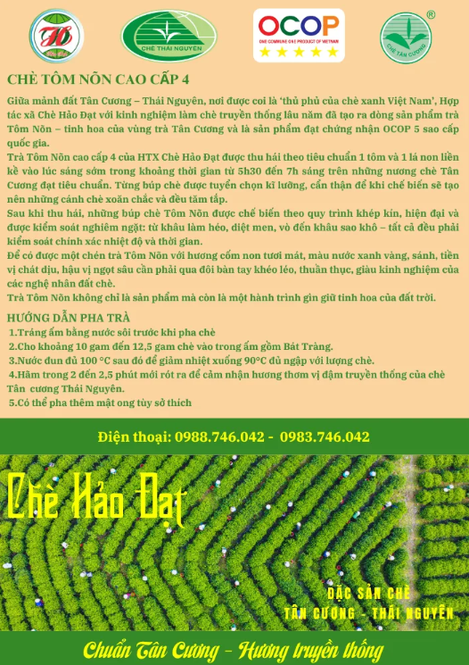Giữa lòng Thái Nguyên – thủ phủ của danh trà Việt Nam, có một vùng đất được thiên nhiên ưu đãi về khí hậu, thổ nhưỡng và truyền thống làm chè lâu đời. Đó là Tân Cương – nơi những đồi chè xanh ngát nối dài đến tận chân mây, cũng là nơi Hợp tác xã Chè Hảo Đạt ra đời, mang trong mình sứ mệnh gìn giữ và lan tỏa tinh hoa trà Việt đến với bạn bè trong nước và quốc tế.